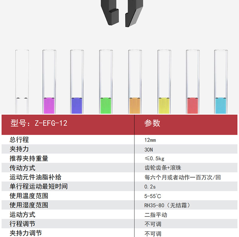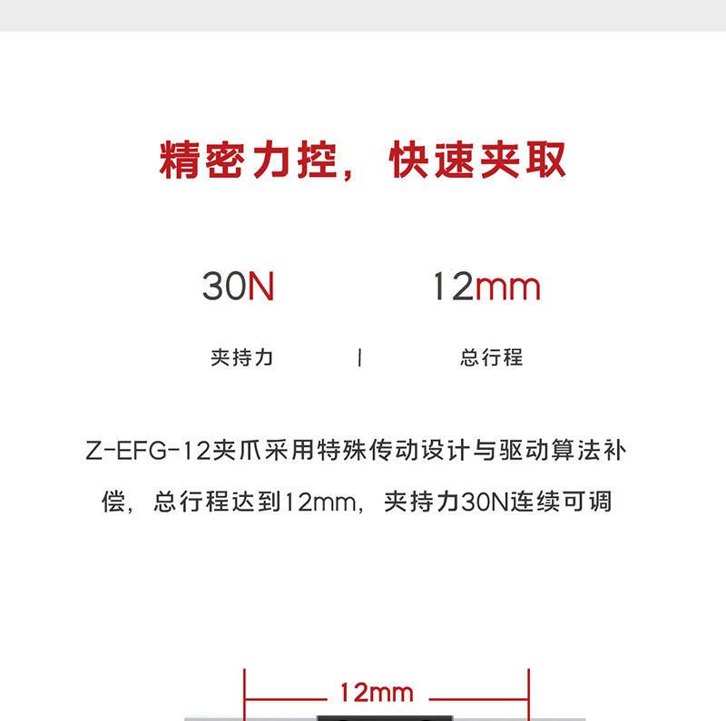 慧靈HITBOT,電動夾爪Z-EFG-12,單行程僅0.2秒,控制器內置何柔性夾持,支持快速夾取易碎物品的功能,可以適應更多的工作場景!