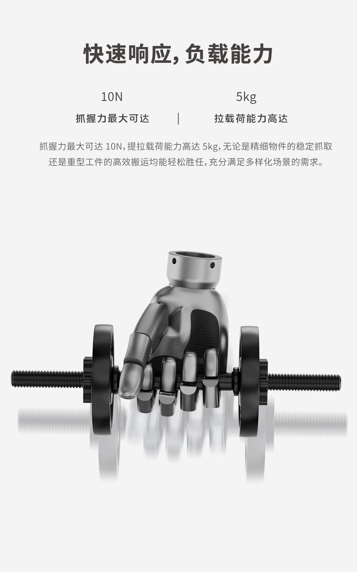 2025年5月13日 pruce 靈巧手, 電動夾爪 0 eHand-6 首頁 / 電動夾爪 / eHand-6 播放視頻 自由度:精準復刻人類抓、捏、握、推動作 負載能力:抓握力最大可達10N,提拉載荷能力高達5kg 毫秒級響應:1.1s完成復雜手勢,速度與穩定性兼得 智能感知:可選配5通道觸覺反饋傳感器 開發兼容性:提供Python/ROS雙API接口 下載3D模型 下載產品手冊 播放視頻 自由度:精準復刻人類抓、捏、握、推動作 負載能力:抓握力最大可達10N,提拉載荷能力高達5kg 毫秒級響應:1.1s完成復雜手勢,速度與穩定性兼得 智能感知:可選配5通道觸覺反饋傳感器 開發兼容性:提供Python/ROS雙API接口 下載3D模型 下載產品手冊 產品描述 資料下載 產品描述 eHand-6 核心參數?61.1s自由度節拍10N10N拇指最大抓握力四指最大抓握力5kg小于800g提拉載荷本體重量*安裝尺寸圖規格參數?詳情產品型號eHand-6自由度6節拍1.1s完成手勢動作四指彎曲角度60°+110°+170°拇指彎曲角度32°+44°+44°拇指側擺角度70°拇指最大抓握力10N四指最大抓握力10N提拉載荷5kg重量<800g傳動方式空心杯電機+行星減速機+絲桿+連桿尺寸220*88*52mm通訊協議CAN FD工作電壓24VDC±10%備注:由于產品不斷推新迭代,產品參數如有變更,恕不另行通知。 資料下載 點擊下載產品手冊點擊下載3D圖點擊下載運動范圍圖 eHand-6 核心參數 產品詳細參數 產品型號eHand-6自由度6節拍1.1s完成手勢動作四指彎曲角度60°+110°+170°拇指彎曲角度32°+44°+44°拇指側擺角度70°拇指最大抓握力10N四指最大抓握力10N提拉載荷5kg重量<800g傳動方式空心杯電機+行星減速機+絲桿+連桿尺寸220*88*52mm通訊協議CAN FD工作電壓24VDC±10%備注:由于產品不斷推新迭代,產品參數如有變更,恕不另行通知。 產品詳情 相關產品