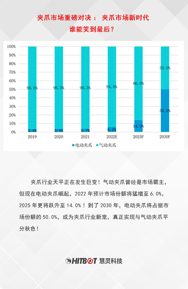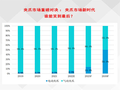 夾爪行業天平正在發生巨變!氣動夾爪曾經是市場霸主,但現在電動夾爪崛起,2022年預計市場份額將猛增至6.0%,2025年更將躍升至14.0%!到了2030年,電動夾爪將占據市場份額的50.0%,成為夾爪行業新寵,真正實現與氣動夾爪平分秋色!