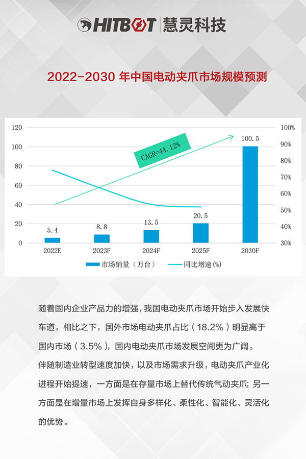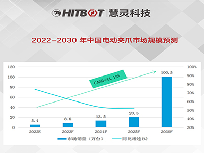 GGII 預計 2022 年銷量有望突破 5.4 萬臺,到 2025 年銷量有望突破 20.5 萬臺,2025年市場規模突破 13 億元;預計到 2030 年電動夾爪銷量有望突破 100 萬臺,市場規模將接近 50 億元,2025-2030 年年均復合增速超過 28%。