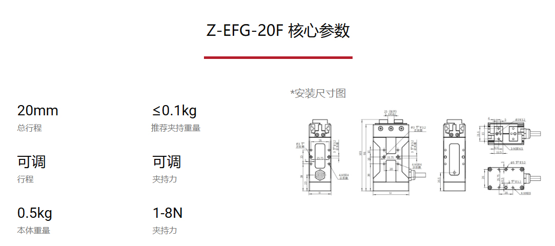產品的單向行程運動最短時間僅為0.1秒,總行程達到20毫米,能夠在狹小的生產空間內,實現高速穩定的夾持。這一性能使得Z-EFG-20F在需要快速響應和高精度操作的生產線上表現出色。