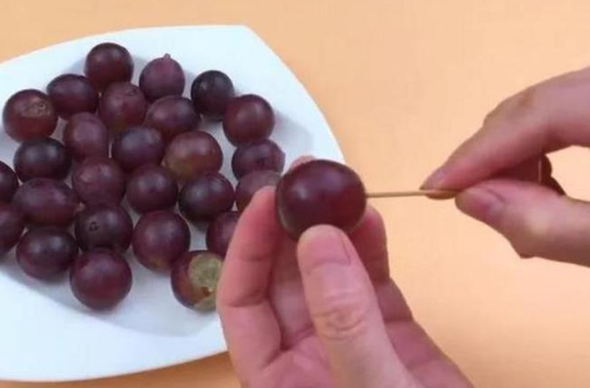 - 用牙簽尖端插進(jìn)葡萄皮與果肉之間。