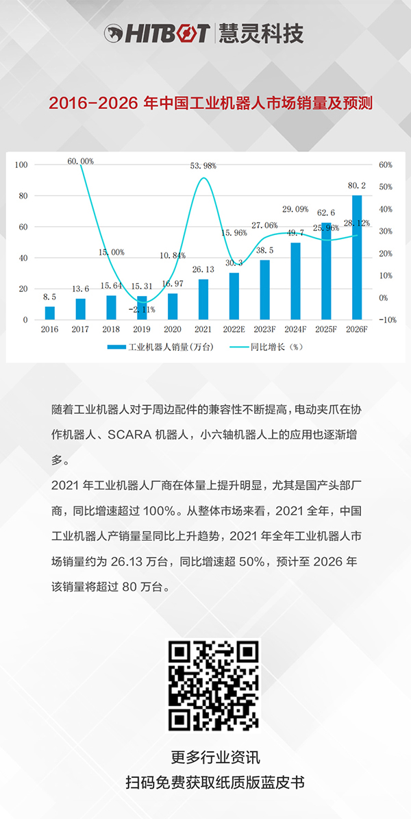 2021 年工業機器人廠商在體量上提升明顯,尤其是國產頭部廠商,同比增速超過 100%。從整體市場來看,2021 全年,中國工業機器人產銷量呈同比上升趨勢,2021 年全年工業機器人市場銷量約為 26.13 萬臺,同比增速超 50%,預計至 2026 年該銷量將超過 80 萬臺。