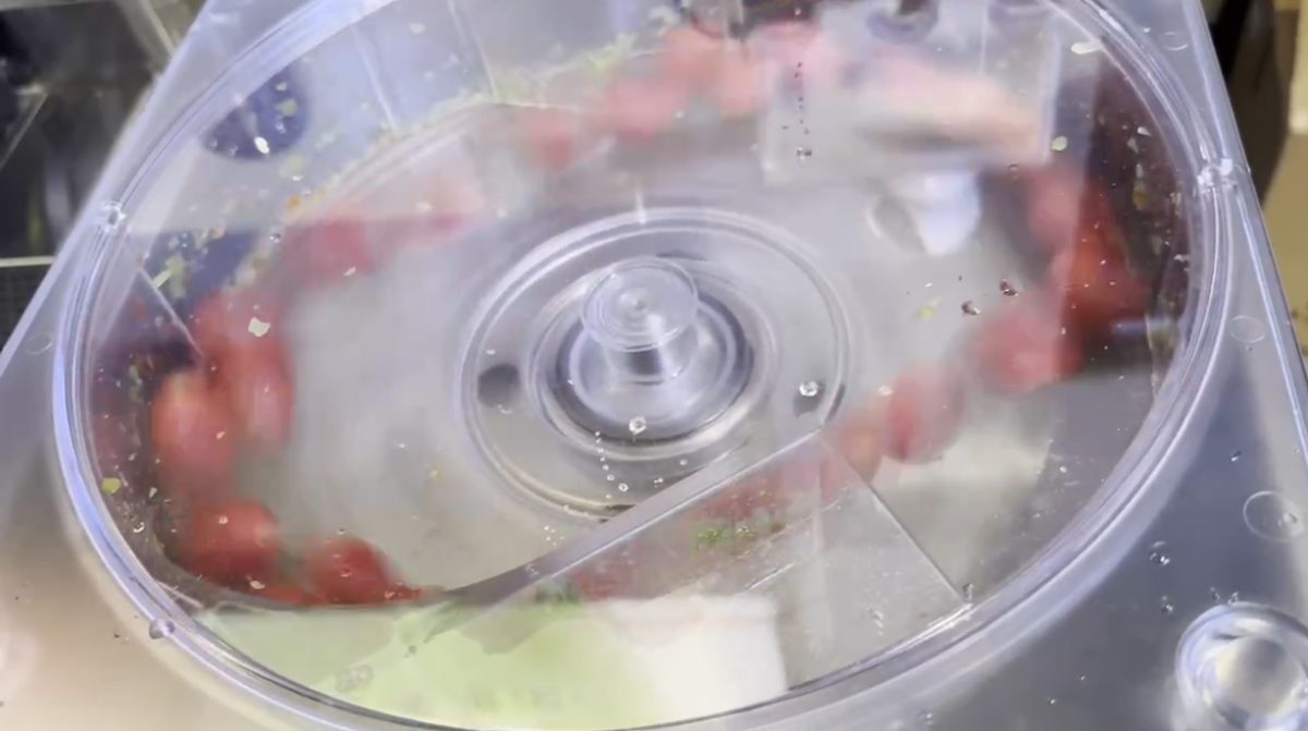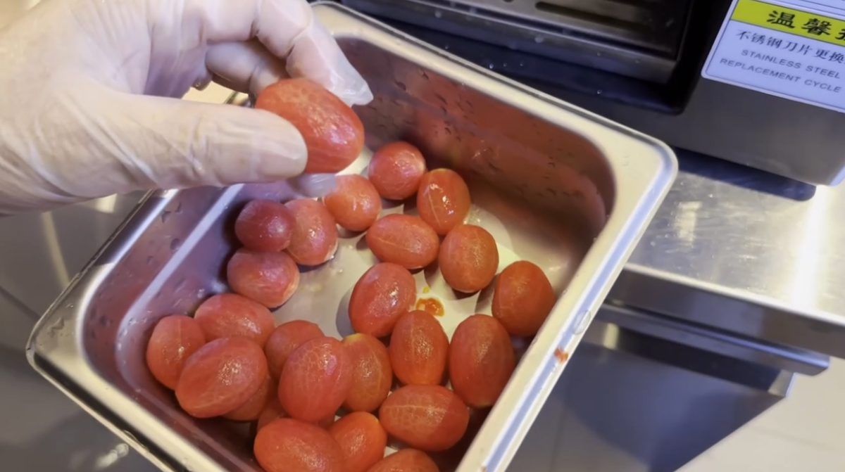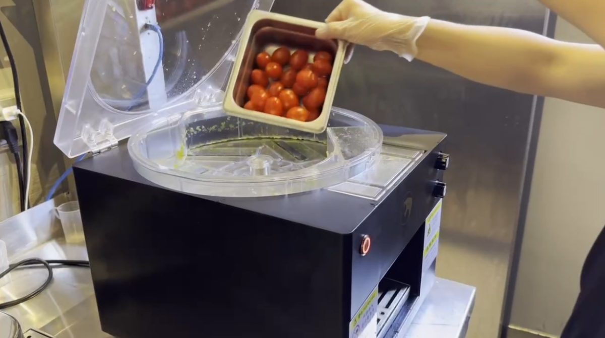 傳統(tǒng)的手動去皮工具往往讓人擔心會浪費果肉,或者削得不均勻。慧靈去皮機通過高速旋轉(zhuǎn)精準地削去圣女果的果皮,力度適中,確保每一顆果實都能均勻去皮而不損失一絲果肉。這個過程既快速又流暢,不用再擔心因手誤而浪費寶貴的果肉了。