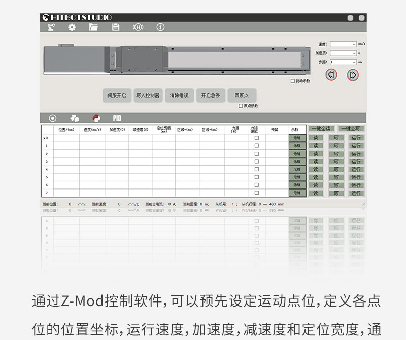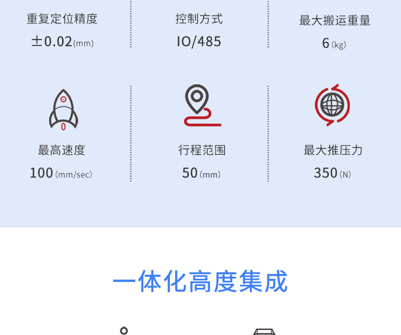 2022年11月9日 Lu, DongWu 智能電缸 0 Z-Mod-MS-80-50 首頁 / 智能電缸 / Z-Mod-MS-80-50 播放視頻 小體積、推力大、高精度、性價比高驅動內置,占用空間小,簡單易操作雙滑塊結構,抗顛覆能力強力、位置、速度都可以通過Modbus精準控制長壽命:千萬次循環(huán),超越氣缸控制方式:485、I/O控制、脈沖 下載3D模型 下載產品手冊 播放視頻 小體積、推力大、高精度、性價比高驅動內置,占用空間小,簡單易操作雙滑塊結構,抗顛覆能力強力、位置、速度都可以通過Modbus精準控制長壽命:千萬次循環(huán),超越氣缸控制方式:485、I/O控制、脈沖 下載3D模型 下載產品手冊 產品描述 資料下載 產品描述 Z-Mod-80-50 核心參數(shù) 1-2mm 100-200N (水平) 導程 ? ? ? ? ?連續(xù)推壓力 50mm 6-12KG 行程 ?有效負載 *線框尺寸圖 規(guī)格參數(shù) 型號性能 行程 50mm 導程 1mm 2mm 最大速度 50mm/s 100mm/s 最大連續(xù)推壓力 200N 100N 最大負載質量 水平:12kg / 垂直:0.5kg 水平:6kg / 垂直:0.5kg 重復定位精度 ±0.02mm 力控精度 ±10% 負載允許力矩 MR:46.8N·m;MP:25.6N·m;MY:25.6N·m 整機重 1.6kg 尺寸規(guī)格 150*80*56mm 控制方式 I/O控制、485總線控制、脈沖控制(脈沖+方向) 工作電壓 DC24V±10% 額定電流 2A 峰值電流 6A 防護等級 IP40 使用環(huán)境 0~40℃,85% RH以下(不結霜) 資料下載 點擊下載產品手冊 點擊下載3D圖 點擊下載運動范圍圖 Z-Mod-MS-80-50 核心參數(shù) 產品詳細參數(shù) 行程 50mm 導程 1mm 2mm 最大速度 50mm/s 100mm/s 最大連續(xù)推壓力 200N 100N 最大負載質量 水平:12kg / 垂直:0.5kg 水平:6kg / 垂直:0.5kg 重復定位精度 ±0.02mm 力控精度 ±10% 負載允許力矩 MR:46.8N·m;MP:25.6N·m;MY:25.6N·m 整機重 1.6kg 尺寸規(guī)格 150*80*56mm 控制方式 I/O控制、485總線控制、脈沖控制(脈沖+方向) 工作電壓 DC24V±10% 額定電流 2A 峰值電流 6A 防護等級 IP40 使用環(huán)境 0~40℃,85% RH以下(不結霜) 產品詳情 相關產品