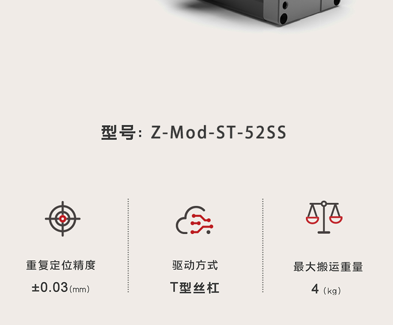2022年1月25日 pruce 智能電缸 0 Z-Mod-ST-52SS 首頁 / 智能電缸 / Z-Mod-ST-52SS 最高速度:水平:180mm/s(1.5kg負載),垂直:120mm/s(2kg負載)最大可搬重量 水平/壁掛: 4kg垂直: 2kg額定推力:100N(水平)重復定位精度:±0.03mm 下載3D模型 下載產品手冊 最高速度:水平:180mm/s(1.5kg負載),垂直:120mm/s(2kg負載)最大可搬重量 水平/壁掛: 4kg垂直: 2kg額定推力:100N(水平)重復定位精度:±0.03mm 下載3D模型 下載產品手冊 產品描述 資料下載 產品描述 Z-Mod-ST-52SS 核心參數 HL42CM04 100N 步進電機規格 額定推力 100~400mm 4kg 行程范圍 最大可搬重量 *線框尺寸圖 規格參數 型號性能 電機功率/電壓 HL42CM04 (對標雷賽42CM04) 額定扭矩( N.m ) 參考曲線性能圖 導程(mm) 12 最高速度(mm/sec) 水平:180(1.5kg?負載) 垂直:120(2kg 負載) 額定加速 / / 最大可搬重量(水平/壁掛)(kg) 4 垂直 2 額定推力(N) 100 (水平) 行程范圍 100-400mm ( 100mm 間隔) 馬達額定轉速(RPM) 參考曲線性能圖 注: 1G=9800mm/sec2,最高速度只做參考,負載與速度成反比 通用規格 重復定位精度 ±0.03mm 驅動方式 T?型絲桿 動態容許力矩(注1) Ma:34.7N.m, Mb:34.7N.m, Mc:55.67N.m 負荷允許伸出長度 120mm 傳感器 / 感應器線纜長度 1.5m 基座材質 擠壓鋁型材,黑色光澤 安裝面積精度要求 平面度0.05mm以下 使用環境 0-40℃, 85%RH(不結霜) 注1:行走壽命為10000km時的數值 尺寸圖代號說明 ? 質量; 單位:mm 有效行程 100 200 300 400 A 236 336 436 536 C 100 200 300 400 ?M 3 4 6 7 N 8 ?10 14 16 ?質量(kg) 1.2 1.48 1.76 2.04 資料下載 點擊下載產品手冊 點擊下載3D圖 點擊下載運動范圍圖 Z-Mod-ST-52SS 核心參數 產品詳細參數 步進電機規格型號HL42CM04(對標雷賽42CM04)額定扭矩(N·m)參考曲線性能圖導程(mm)12最高速度(mm/sec)水平:180(1.5kg負載)垂直:120(2kg負載)額定加速度 (mm/sec2)//最大可搬重量 水平/壁掛(kg)4垂直2額定推力(N)100(水平)行程范圍(mm)100-400(100間隔)馬達額定轉速(RPM)參考曲線性能圖注:1G=9800mm/sec2 最高速度只做參考,負載與速度成反比。重復定位精度±0.03mm驅動方式T型絲杠動態容許力矩(注1)Ma:34.7N·m,Mb:34.7N·m,Mc:55.67N·m負荷允許伸出長度120mm傳感器/感應器線纜長度1.5m基座材質擠壓鋁型材,黑色光澤安裝面積精度要求平面度0.05mm以下使用環境0-40°C,85%RH](不結霜)注1:行走壽命為10000km時的數值 規格參數 型號性能電機功率/電壓HL42CM04 (對標雷賽42CM04)額定扭矩( N.m )參考曲線性能圖導程(mm)12最高速度(mm/sec)水平:180(1.5kg?負載)垂直:120(2kg 負載)額定加速//最大可搬重量(水平/壁掛)(kg)4垂直2額定推力(N)100 (水平)行程范圍100-400 ( 100 間隔)馬達額定轉速(RPM)參考曲線性能圖注: 1G=9800mm/sec2,最高速度只做參考,負載與速度成反比通用規格重復定位精度±0.03mm驅動方式T?型絲桿動態容許力矩(注1)Ma:34.7N.m, Mb:34.7N.m, Mc:55.67N.m負荷允許伸出長度120mm傳感器/感應器線纜長度1.5m基座材質擠壓鋁型材,黑色光澤安裝面積精度要求平面度0.05mm以下使用環境0-40℃, 85%RH(無結霜)注1:行走壽命為10000km時的數值尺寸圖代號說明 ? 質量; 單位:mm有效行程100200300400A236336436536C100200300400?M3467N8?101416?質量(kg)1.21.481.762.04 產品詳情 相關產品